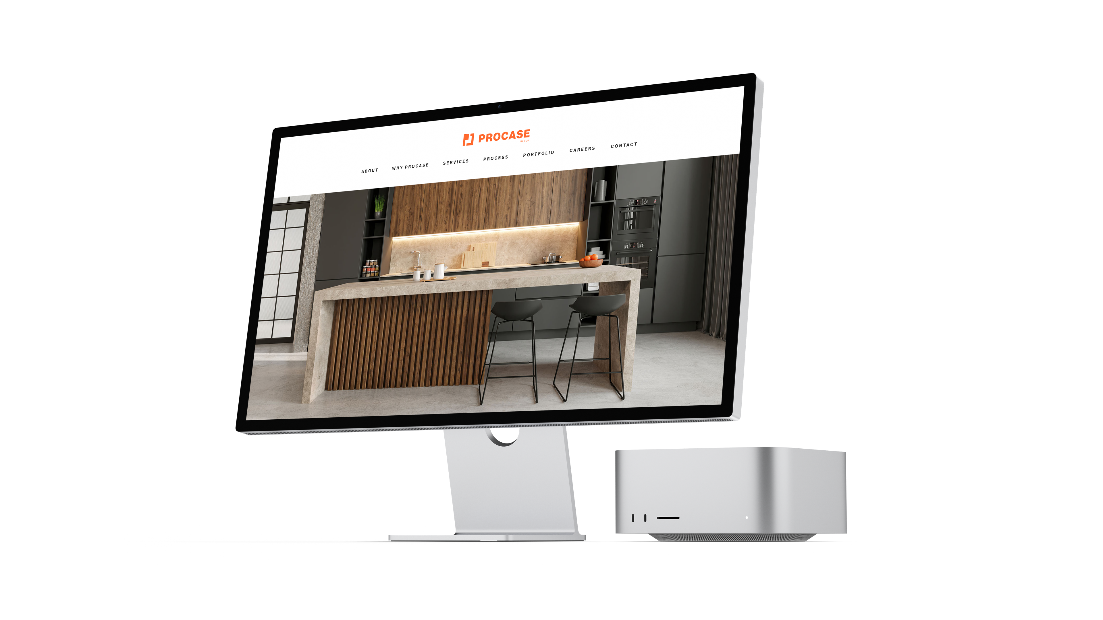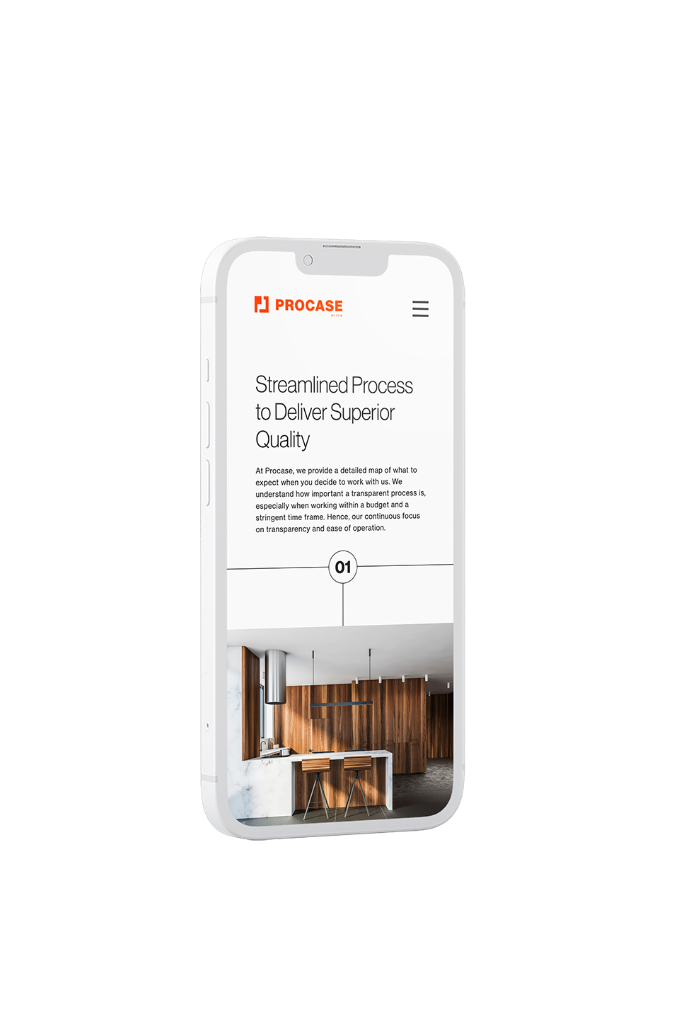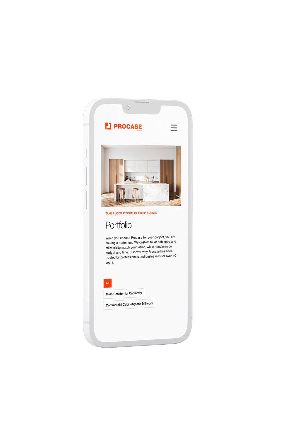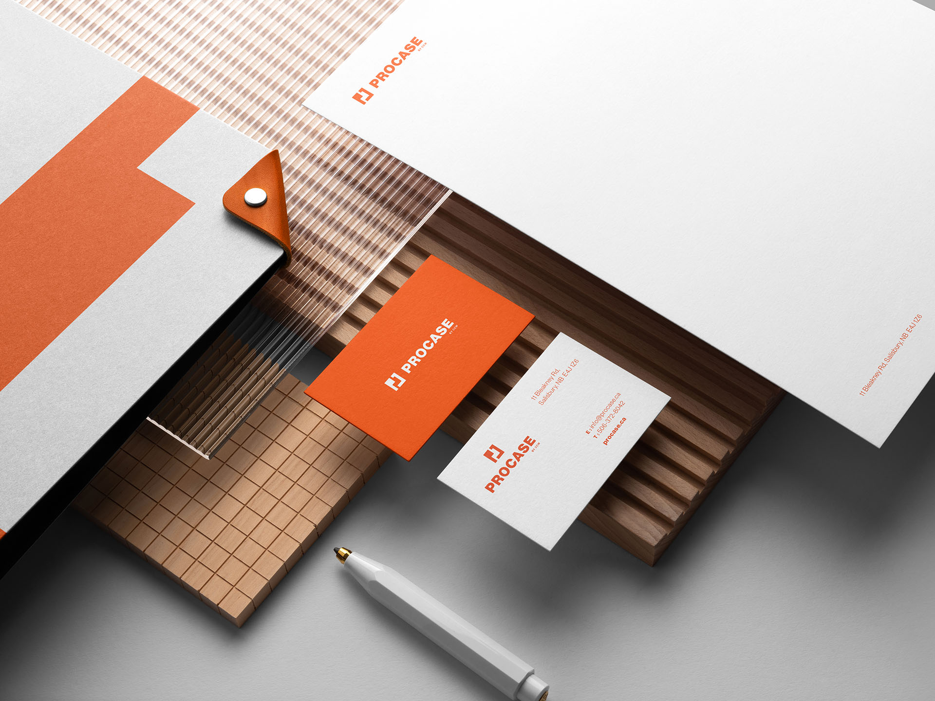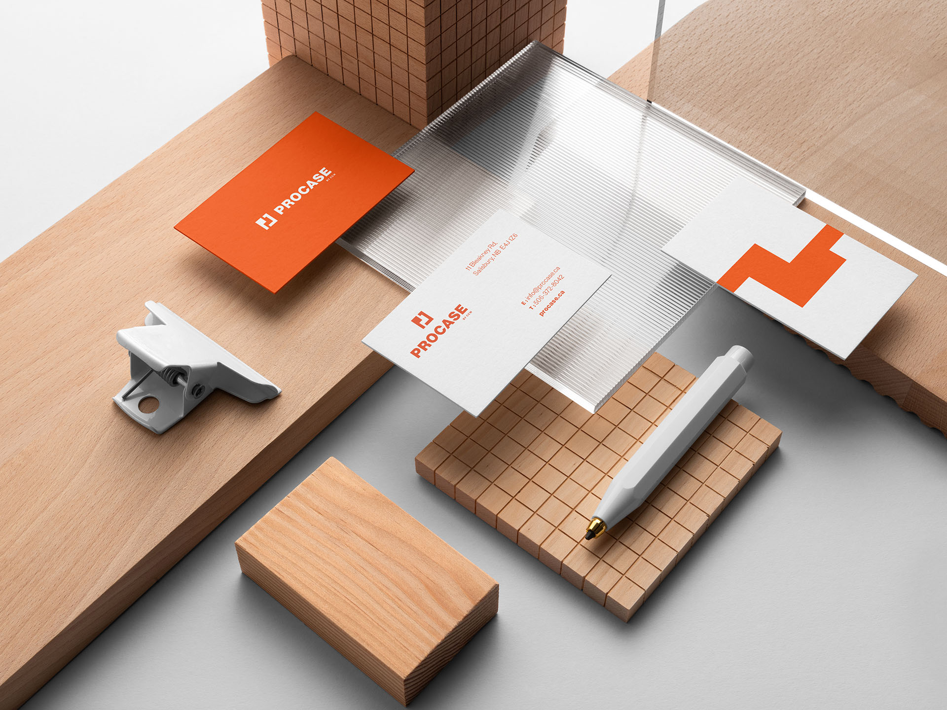 We constructed a logo built around Procase’s product: cabinets. The inset in square forms both the shape of a cabinet protruding from a wall, and the letter “P” for Procase. The right angles in the icon evoke blueprints, triangle squares, rulers and other tools used in the cabinetry trade that speak to precision and quality. A deep rich orange, monochromatic palette allows for a high contrast presentation of the brand, while conveying a notion of timelessness. The typeface selected for this brand is Neu Haas Grotesk, which is appropriately professional and legible.